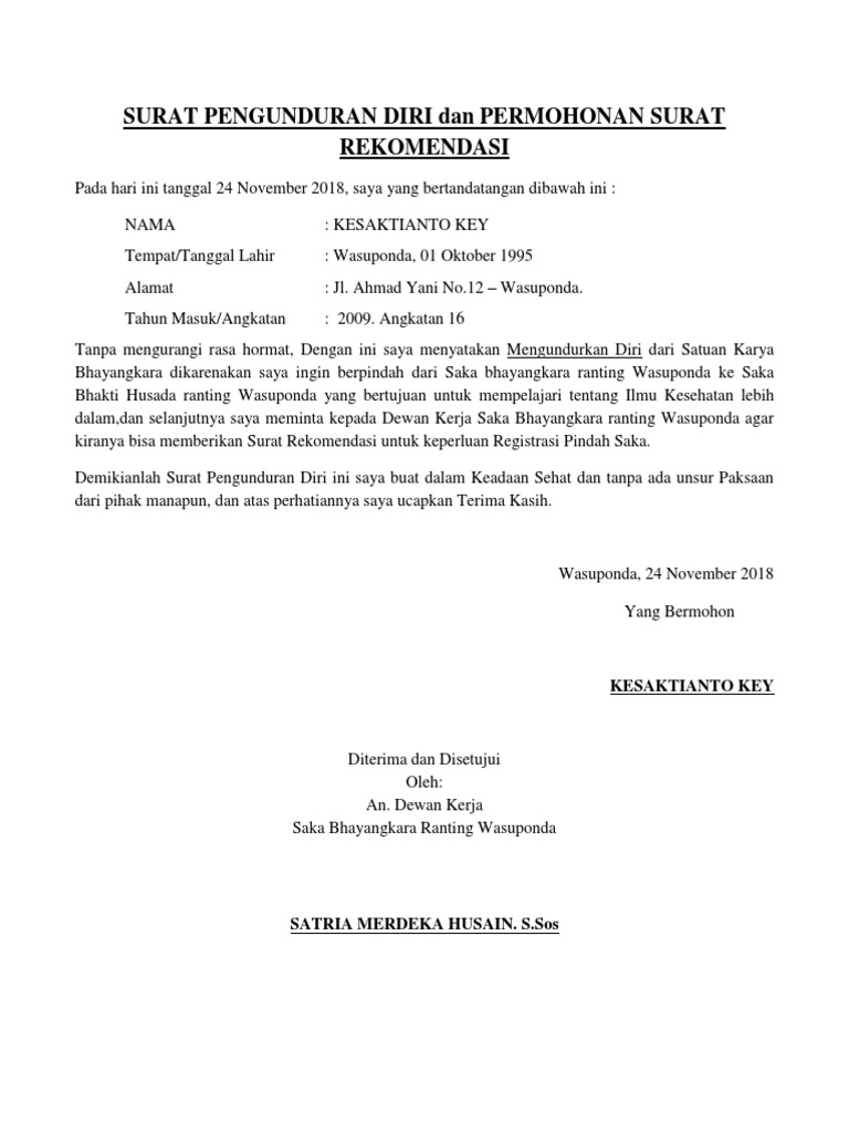Contoh surat pengunduran diri organisasi. Contoh surat pengunduran diri kerja yang baik dan sopan. Berikut beberapa contoh surat pengunduran diri atau surat resign dengan penulisan yang benar dan sopan pramuka no.142 bandung bandung jawa barat. Mengundurkan diri dari sebuah organisasi adalah sebuah keputusan yang sangat besar dan untuk merealisasikan keputusan yang sudah dibuat tentu kita harus membuat surat pengunduran diri yang baik. Entah bagi yang ingin resign dari tempat kerja di perusahaan yang selama ini ia bernaung di bawahnya atau dari jabatan tertentu.